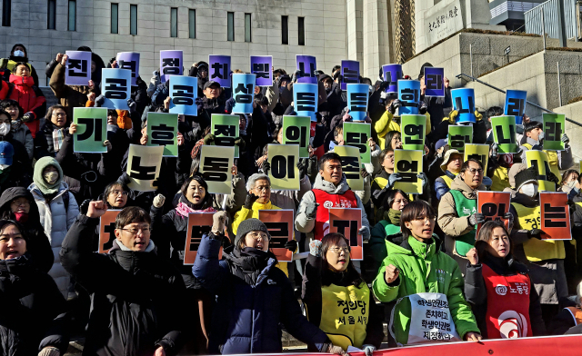 김선영 금속노조 자동차판매연대지회 지회장도 "노동자들이 20년 넘게 요구한 노란봉투법을 윤석열이 2번이나 거부권을 행사했지만 이재명 정부에서 통과됐다"면서도 "이재명 정부에서 시행령을 통해 다시 노란봉투법의 취지를 무력화하고 있다. 노동자에게 선심 쓰듯 줬다 뺐는 그런 형국"이라고 꼬집었다.