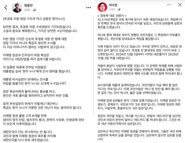 비상계엄에 대한 사과를 거부한 장동혁 대표와 의견을 같이한 의원도 있었다. 직전 부산시당위원장이기도 했던 박수영 의원(부산 남구)은 "비상계엄은 의회 폭거에 맞서기 위한 계엄"이라고 주장한 장 대표의 성명서를 그대로 게시했다. 박 의원은 이어 '고물가 민생 폭격'이라는 제목의 글에서 "이재명 정부가 만든 민생 경제파탄의 악순환이 깊어지고 있다"고 했다.