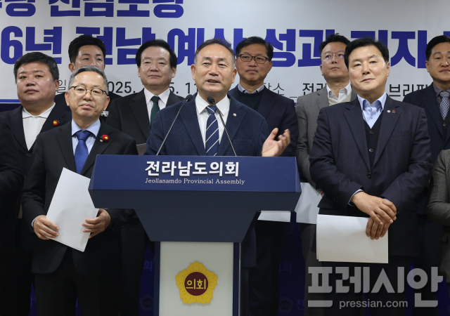 김 위원장은 기자회견을 통해 지난 2일 국회에서 확정된 2026년 국가예산안에서 전남도가 역대 최다 규모인 10조 42억원의 국비를 확보한 데 따른 주요 사업 현황 및 예산 반영 현황을 발표했다.
