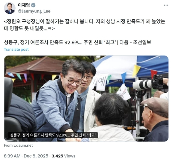 이 대통령은 8일 자신의 소셜미디어 X(옛 트위터)에 성동구가 '구민 1500명 대상 정기 여론조사에서 구정 만족도 92.9%를 기록했다'는 언론보도를 게시하면서 "정원오 구청장이 일을 잘하기는 잘하나보다", "저의 성남시정 만족도가 꽤 높았는데 저는 명함도 못 내밀 듯"이라고 적었다.