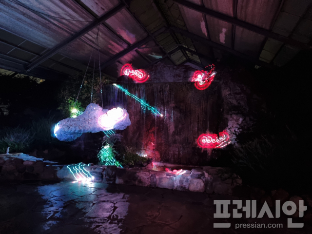 특히 전시관 중앙의 폭포에서는 물줄기 위로 흐르는 빛과 레이저 라이트가 조화를 이루며 강렬한 시각적 효과를 연출한다.