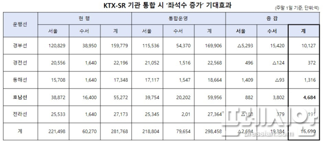 고속철도 통합이 이뤄지면 서울역-수서역 교차운행과 기차 회전율 증대를 통해 주말 1일 기준 전국 고속철 좌석수가 약 1만 6690석 증가하고, 호남선은 약 4684석 증가할 것으로 예측하고 있다. 호남선 서울역 기준 882석, 수서역 기준 3802석이 늘어난다.
