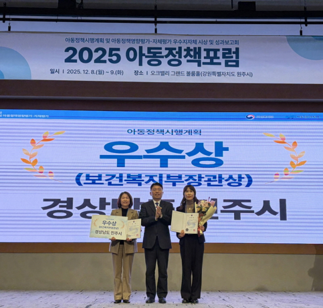 경남 진주시는 지난 8일 강원도 원주시 오크밸리 리조트에서 열린 '제13회 아동정책포럼'에서 2024년 아동정책 시행계획 추진실적 평가에서 '우수' 지자체로 선정돼 보건복지부 장관상을 수상했다.