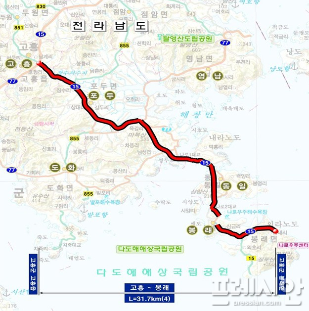 '국도 15호선 고흥~봉래 4차로 확장공사'는 총길이 31.7㎞ 구간을 기존 2차로에서 4차로로 확장하는 사업으로, 총사업비 6521억 원이 투입된다. 올해 1월 신속예타 선정 후 약 7개월 노력 끝에 8월 예비타당성 통과라는 성과를 냈다.