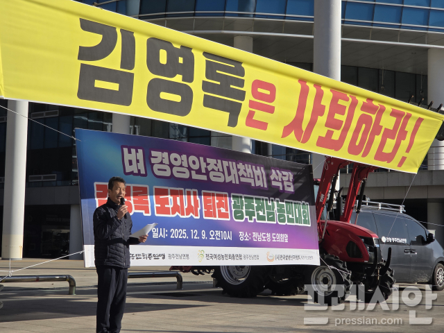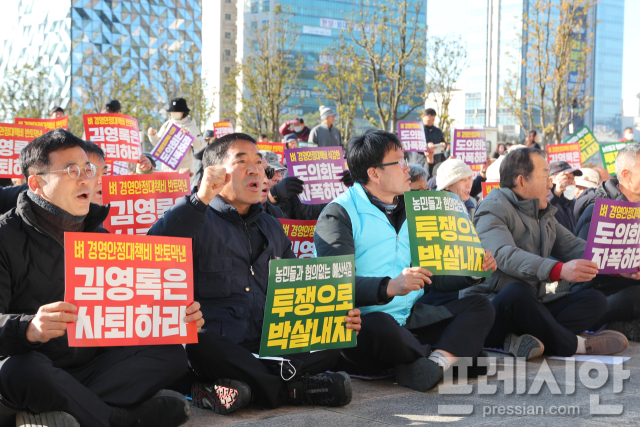 전국농민회총연맹 광주전남연맹, 쌀협회 전남본부, 전국여성농민회총연합 광주전남연합 등 3개 단체(이하 단체) 회원 200여 명은 9일 전남도청 앞에서 집회를 열고 "벼 경영안정대책비 반토막 낸 김영록 전남도지사는 책임지고 물러나라"고 성토했다.