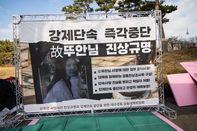 9일 고(故) 뚜안 사망사건 대응을 위한 대구경북대책위원회, 이주노동자평등연대 등이 서울 용산 대통령실 앞에서 기자회견을 열고 뚜안 씨 죽음의 진상규명과 정부의 미등록 이주민 강제단속 중단을 요구하는 농성에 돌입한다고 밝혔다. 부반숭 씨도 딸의 영정을 들고 함께했다.