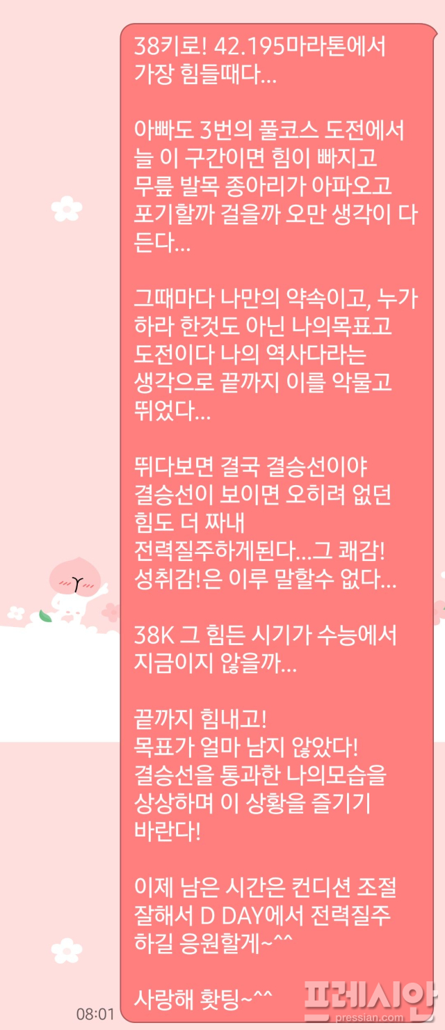 메시지에는 “목표가 얼마 남지 않았다. 결승선을 통과하는 너의 모습을 상상하며 이 상황을 즐기길 바란다. 사랑해, 화이팅”이라는 아버지의 진심이 고스란히 담겨 있다.