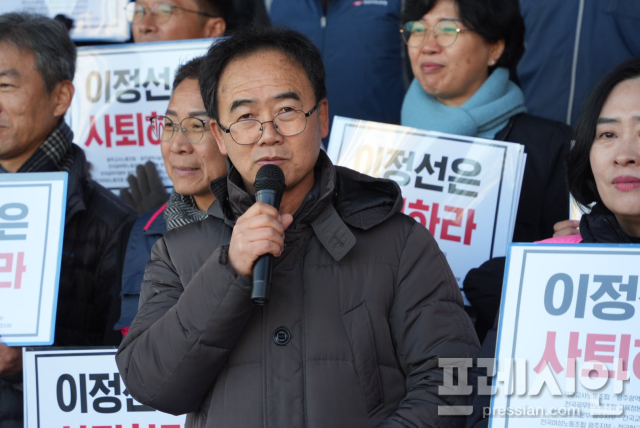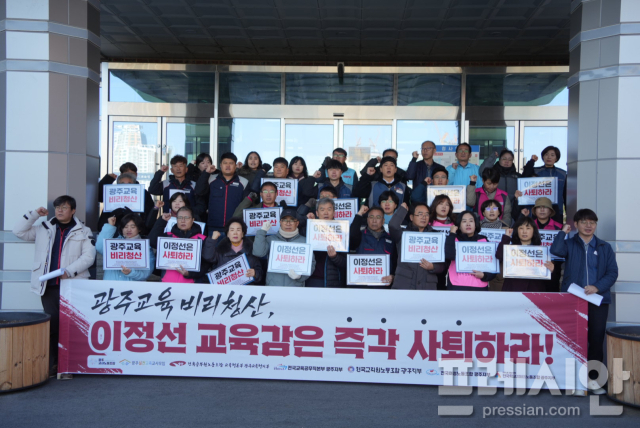 광주교사노조, 전교조 광주지부, 민주노총 광주본부 등 10여 개 노동·시민단체는 이날 오전 시교육청 앞에서 공동 기자회견을 열고 "비리 교육감은 필요 없다. 이정선 교육감은 즉각 사퇴하라"고 목소리를 높였다.