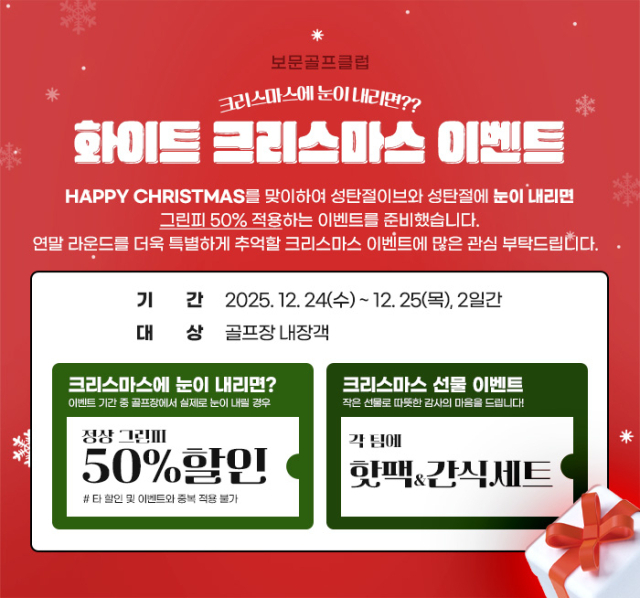 ‘2025 화이트 크리스마스 이벤트’행사는 겨울철 골프의 특별한 매력을 더하고 고객 감사의 의미를 담아 기획된 것으로, 이벤트 기간 동안 눈이 내릴 경우 그린피 50% 할인 혜택이 주어진다.