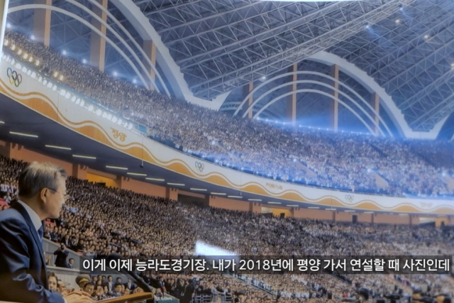 문 전 대통령은 '이 책의 저자처럼 본인도 유의미한 물건을 수집해 놓은 것이 있느냐'는 진행자 질문을 받고 2018년 평양 방문 당시 연설 장면을 찍은 'B컷' 사진과 강원 고성군 전방초소(GP)를 촬영한 사진 등 2점의 사진을 들어 보였다.
