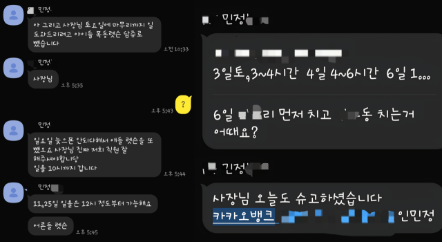 김 씨와 10여 년간 막역한 사이로 지낸 측근 A 씨를 통해 확인한 문자메시지 기록을 보면, 김 씨의 현 배우자 인민정 씨는 A 씨에게 근무 일자를 조율하거나 "사장님 진짜 저희 직원(김 씨) 잘 해주셔야 한다" 등의 메시지를 보냈다. 김 씨가 근무를 마친 뒤에는 자신의 계좌번호를 보내며 일당을 보내 달라고 요청하기도 했다.