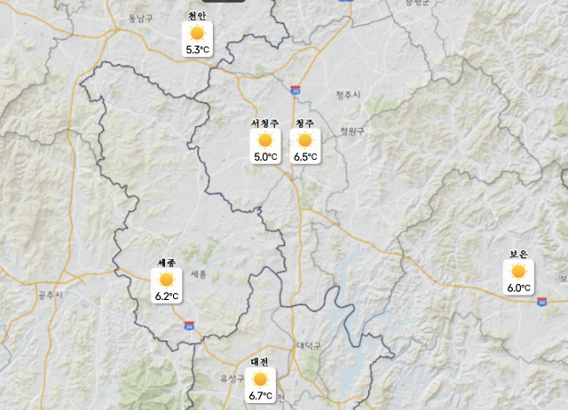 대전지방기상청에 따르면 대전과 홍성 등 충청권 주요 관측지점에서 현재 기온은 6도 안팎이며 구름 없이 맑은 하늘이 이어지고 있다. 다만 체감온도는 어제보다 약 2도 낮은 4도로 다소 춥게 느껴질 수 있다.