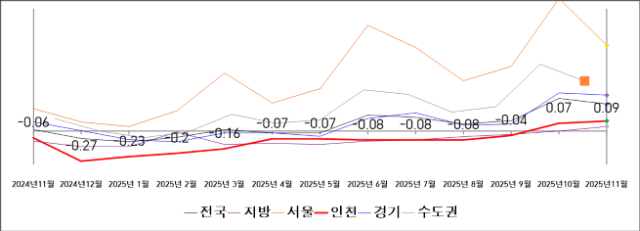 인천시가 한국부동산원 통계를 분석해 발표한 ‘2025년 11월 부동산시장 동향 보고서’에 따르면 11월 인천의 주택 매매가격지수 변동률은 0.09%로 전월(0.07%)보다 상승폭이 확대됐다.