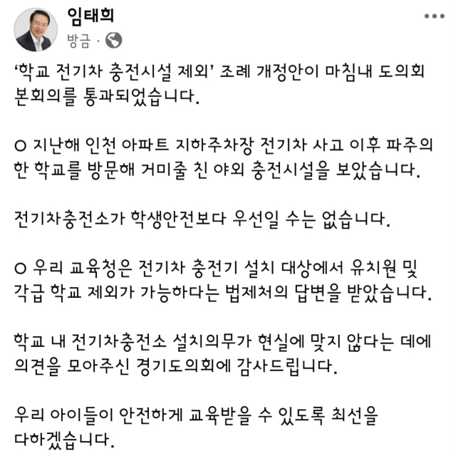 한편, 임태희 경기도교육감은 이날 자신의 SNS를 통해 "마침내 ‘학교 전기차 충전시설 제외’ 조례 개정안이 도의회 본회의를 통과했다"며 "전기차충전소가 학생 안전보다 우선일 수는 없다"고 전했다.