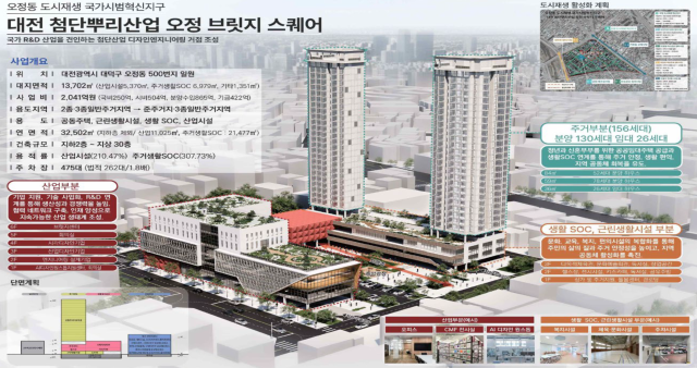 이번에 선정된 오정 국가시범지구(도시재생 혁신지구)는 대덕구청사 이전 부지 일원 1만 3702㎡ 규모로 국비 250억 원을 포함해 총 2041억 원이 투입될 예정이다. 사업 기간은 2026년부터 2030년까지 5년간이다.