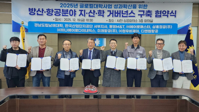 경남도립남해대학은 지난 19일 사천시 상공회의소 3층 회의실에서 지역 항공산업의 지속 가능한 성장과 경쟁력 강화를 위해 '2025 RISE·글로컬대학사업 성과 확산을 위한 항공산업 지·산·학 협력 거버넌스 구축과 업무협약 체결식'을 가졌다.
