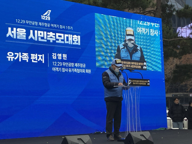 지난해 12월 29일 무안공항 제주항공 여객기 참사로 아내와 두 아들을 잃은 김영헌씨가 12일 오후 서울에서 열린 '12.29 무안공항 제주항공 여객기 참사 1주기 서울 시민 추모대회' 무대에 섰다. 그는 먼저 떠나 보낸 가족을 위해 쓴 추모 편지를 낭독했다.