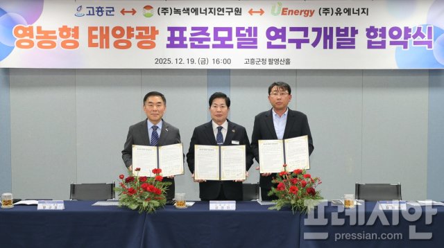 군은 지난 19일 군청 팔영산홀에서 (재)녹색에너지연구원(원장 황규철), ㈜유에너지(대표 최태원)와 '고흥형 영농형 태양광 표준모델' 연구개발 추진을 위한 업무협약을 체결했다.