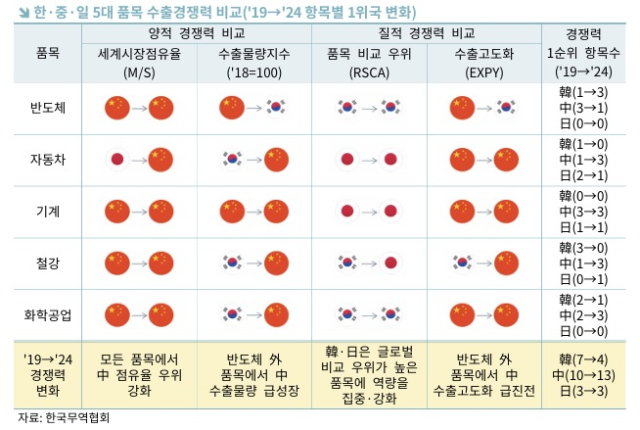 보고서는 "중국은 철강, 화학공업, 자동차 등 전통 제조업에서 물량 확대로 시장 점유율 확보 전략을 취하는 동시에 선진국형 수출구조로 빠르게 전환해 한국과 일본의 경쟁력을 압도했다"고 설명했다.