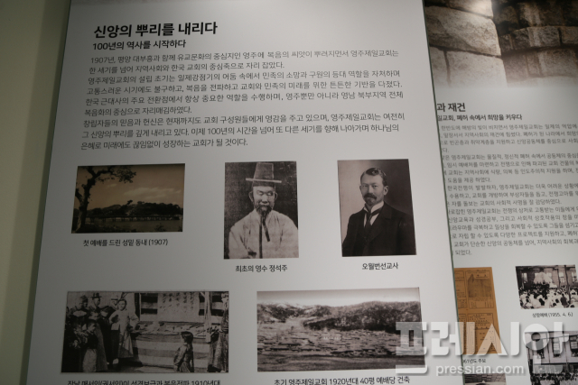 영주제일교회는 1907년 오월반 선교사의 전도로 시작돼 1908년 정석주 장로 사택에서 10여 명이 드린 예배를 출발점으로 성장했다. 1909년 4월 초가삼간 예배당에서 본격적인 교회 공동체를 형성했으며, 2009년 창립 100주년을 거쳐 현재 116년의 역사를 이어오고 있다. 그동안 교회는 영주 지역 신앙의 중심이자 공동체의 구심점으로 자리해 왔다.