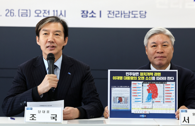 그는 "조국혁신당은 호남 정치를 복원하겠다"며 "호남 정치는 대한민국 발전을 추동한 동력이었다"고 했다. 그는 "21세기 대한민국의 민주주의는 '민주당 독점주의'가 아니다. 민주당 공천만 받으면 당선이 되는 구조는 호남 정치 발전에 도움이 되지 않는다"고 호소했다.