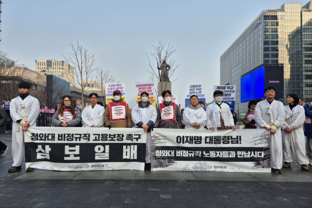 이재명 대통령이 청와대로 복귀한 날, 일자리를 잃게 된 청와대 비정규직 노동자들이 거리에서 삼보일배를 하며 고용보장 대책 마련을 촉구했다.