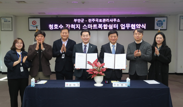 전북 부안군과 익산지방국토관리청 전주국토관리사무소가 '부안 청호수 간척지 스마트복합쉼터 조성사업'의 원활한 추진을 위한 업무협약(MOU)을 체결했다.