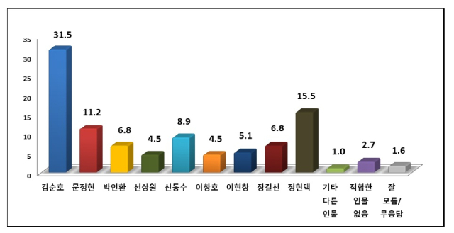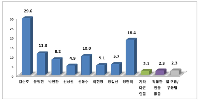 이외 기타 다른인물 1.0%, 적합한 인물 없음 2.7%, 잘모름·무응답 1.6%였다.