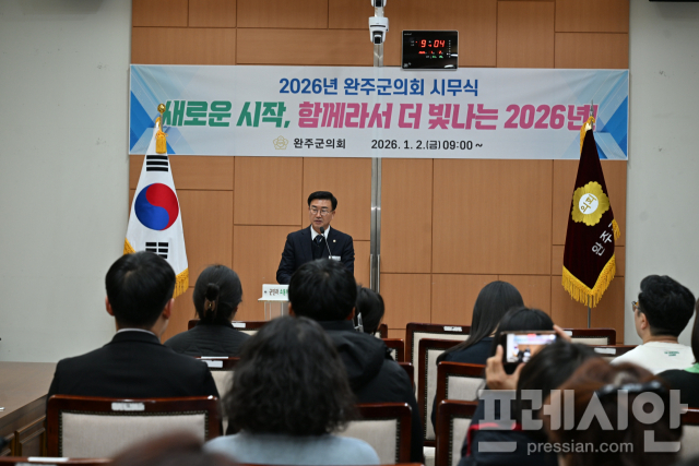 완주군의회는 2일 의회 문화강좌실에서 2026년 시무식을 개최했다. 이날 시무식에는 군의원 11명 전원과 사무국 직원 등 40여 명이 참석해 새해 의정 방향을 공유하고 각오를 다졌다.