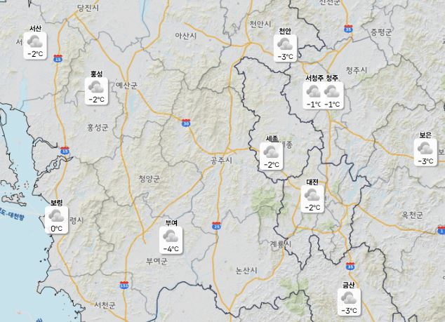 4일 낮 최고기온은 대전·천안 4도, 세종·청주 5도로 예상되며 최저기온은 -2도 안팎을 기록할 것으로 보인다.