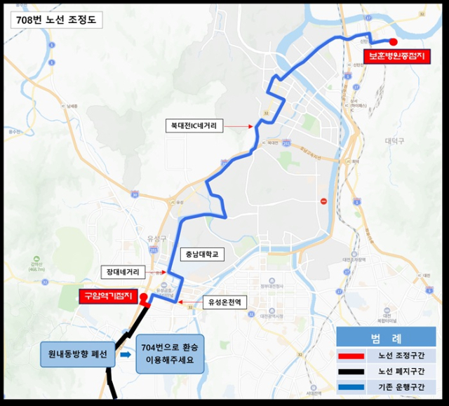 704번은 원내동~죽동산업단지로 조정되고 죽동 일대 정류장이 신설되며 구암역~보훈병원을 잇는 708번이 새로 운행된다.