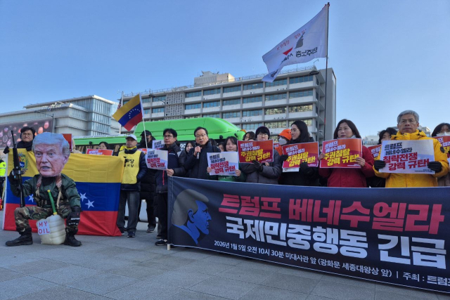 국제전략센터, 팔레스타인평화연대 등 72개 단체가 참여한 '트럼프 1년 규탄 국제민중공동행동 조직위원회'는 5일 서울 종로 주한 미국대사관 인근에서 기자회견을 열고 "미국은 자국의 이익을 위해서라면 국제법도 무시하고 한 나라의 주권을 짓밟고 대통령까지 납치, 축출할 수 있다는 것을 적나라하게 보여줬다"며 "그리고 미국은 베네수엘라의 정권이 이양될 때까지 미군을 주둔시키고 베네수엘라를 통치하겠다고 선언했다"고 지적했다.