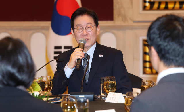 ▲중국을 국빈방문 중인 이재명 대통령이 7일 상하이의 한 호텔에서 열린 순방 기자단 오찬 간담회에서 취재진 질문에 답하고 있다. ⓒ연합뉴스