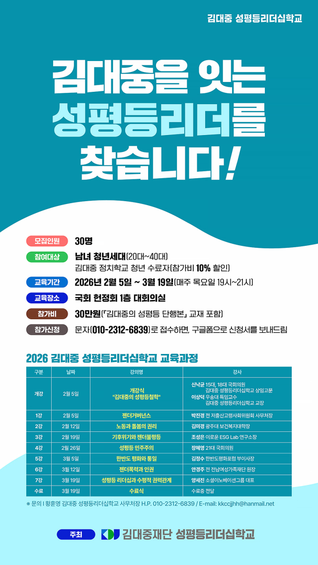 <김대중재단>이 오는 2월 5일 ‘김대중 성평등리더십학교’를 개설한다. 재단은 "이번 과정은 20~40대 남녀 청년세대를 대상으로, 성별과 입장의 차이를 넘어 민주주의와 성평등, 리더십이라는 공동의 질문을 함께 나누고 연결하는 장을 만드는 데 목적이 있다"고 밝혔다.