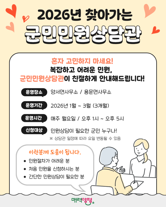 이번 시범운영은 1월부터 3월까지 3개월간 진행되며, 양서면과 용문면 2개 지역을 대상으로 한다. 군은 면사무소를 중심으로 상담 창구를 마련해, 군민들이 보다 편리하게 행정 상담을 받을 수 있도록 했다.