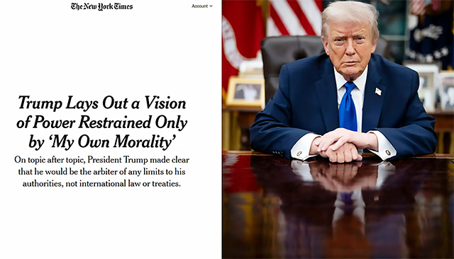 8일(이하 현지시간) 미 일간지 <뉴욕타임스>는 트럼프 대통령과 7일 인터뷰를 가졌다면서 "트럼프 대통령은 전 세계를 상대로 군사력을 사용해 타격하거나 침공, 압박할 수 있는 본인의 권한에서 국제법이나 기타 제약은 중요하지 않다며, 군 최고통수권자로서의 권한은 오직 '자신의 도덕성‘에 의해서만 제한된다고 말했다"고 보도했다.