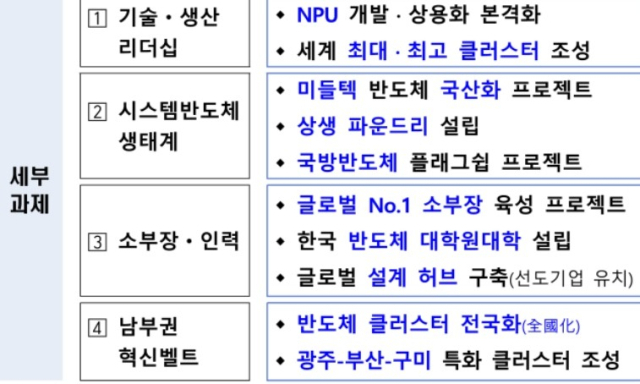 산업부는 또 '남부권 혁신벨트'와 관련해 광주(첨단패키징)와 부산(전력반도체), 구미(소재·부품) 등 3곳을 콕 찍어 새로운 반도체 생산거점 기반을 닦는다고 말했다.