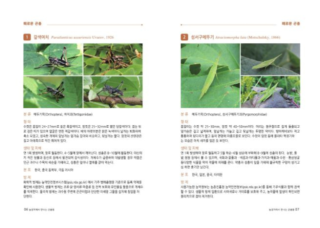 구성도 현장 친화적이다. 1장은 농작물 피해와 직결되는 해로운 곤충 51종을 다뤘다. 종별 형태와 생태, 피해 양상, 분포 지역, 방제 방법을 정리해 해충 발생 시 참고할 수 있도록 했다.