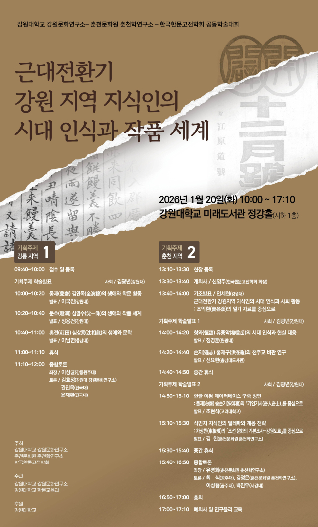 행사는 1부와 2부로 나뉘어 진행된다. 오전 세션에서는 안세현 강원대 교수의 기조강연 ‘근대전환기 강원 지역 지식인의 시대 인식과 사회 활동–조익환(曺益煥)의 일기 자료를 중심으로’를 시작으로, 유중악(柳重岳), 홍재구(洪在龜) 등 전통 지식인의 사상과 문학 활동을 다룬다.