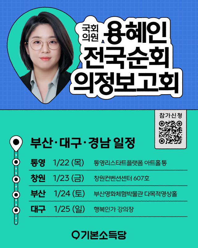 용혜인 의원은 오는 22일부터 25일까지 나흘간 통영, 창원, 부산, 대구를 차례로 찾는 '국민과 함께 한 걸음 더' 영남권 의정보고회를 연다. 대구 일정은 투어의 마지막 날인 25일 오후 2시 '행복인가 강의장'에서 진행된다.
