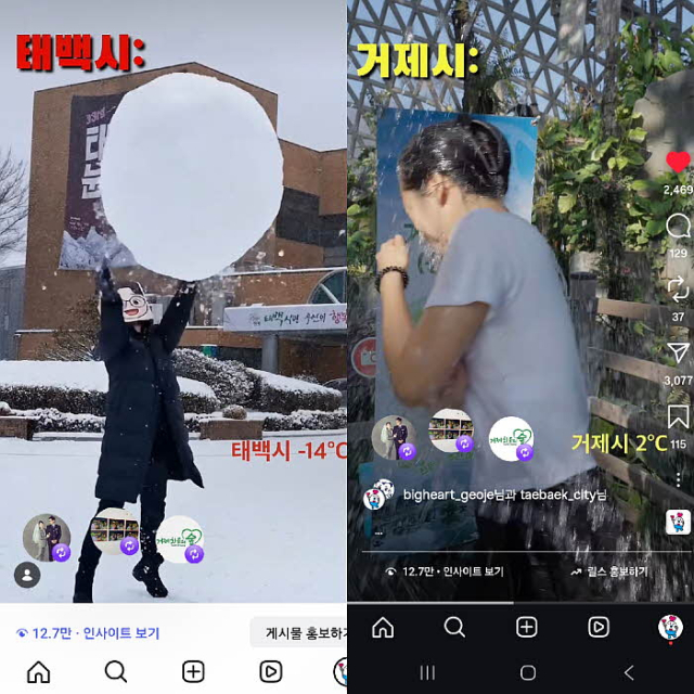 이 영상은 눈이 자주 내리고 기온이 낮은 태백시와 상대적으로 따뜻하고 눈이 거의 오지 않는 거제시의 기후 차이를 활용한 지자체 협업 콘텐츠다.
