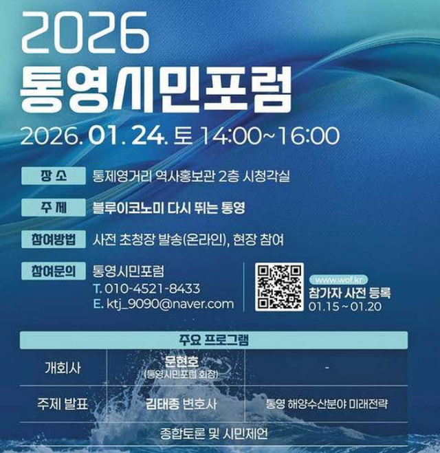 통영시민포럼 관계자는 "통영의 위기와 기회는 모두 바다에서 시작된다. 이번 포럼은 정답을 제시하는 자리가 아니라 무엇이 가장 현실적이고 무엇부터 시작해야 하는지를 시민과 함께 확인하는 출발점이 될 것"이라고 밝혔다.