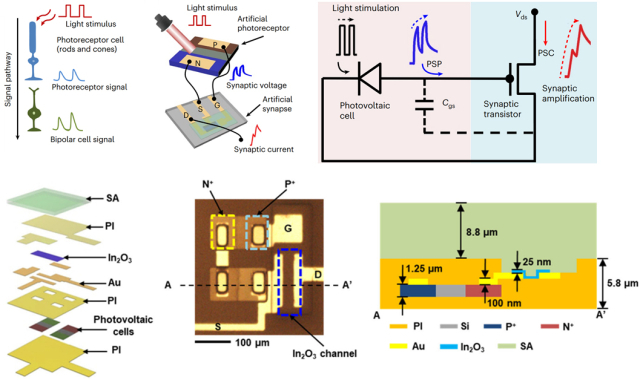 연구팀은 실리콘 태양전지와 전해질 기반 시냅스 트랜지스터를 직렬로 연결한 2단 직렬 광전 시냅스 구조를 통해 인간 망막에서 나타나는 시냅스 촉진 특성을 높은 수준으로 구현했다. 이를 다수 집적한 키리가미 구조 기반 설계 사람 눈과 유사한 곡률의 곡면 소자를 통해 촬상과 동시에 신호 전처리 및 데이터 보존이 가능함을 실증했다.