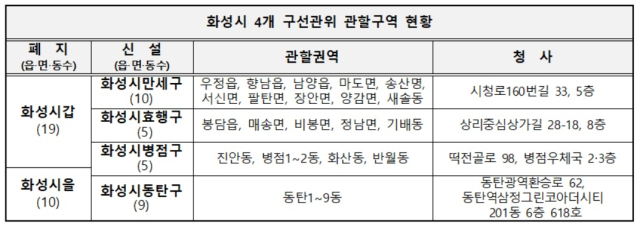 경기선관위에 따르면 기존에 운영되던 화성시갑·을선거관리위원회가 폐지되고, 화성시만세구·효행구·병점구·동탄구 등 4개 구선거관리위원회가 신설된다.
