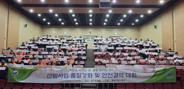 북부지방산림청(청장 송준호)은 2026년 산림사업을 시작하기에 앞서 산림사업의 품질을 향상하고 안전사고 없는 산림사업장을 만들기 위해 ‘산림사업 품질강화 및 안전결의 대회’를 22일 개최했다.