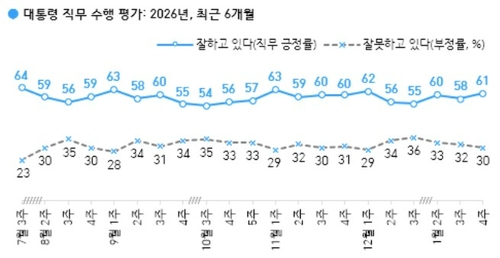이재명 대통령의 직무수행에 대해 '잘하고 있다'는 긍정 평가가 61%, '잘못하고 있다'는 부정 평가가 30%로 나타났다.