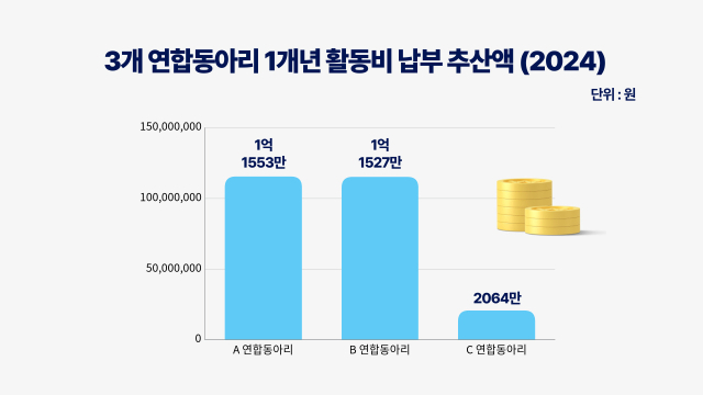 추산 결과 A 연합동아리는 봄·여름·가을 시즌 약 160~180명, 겨울 시즌 약 120~130명이 활동한 것으로 나타났다. B 연합동아리 역시 시즌별로 최소 140명에서 최대 190명이, C 연합동아리는 처음 창설된 봄 시즌에는 6명, 이후에는 시즌마다 약 20~60명이 활동한 것으로 추산했다. 3개 연합동아리의 활동비는 홈페이지에 공개된 대로 봄 시즌 19만~23만2000원, 여름 시즌 12만6000원, 가을 시즌 19만~24만2000원, 겨울 시즌 12만8000원으로 계산했다. 대학 정규 학기가 진행되는 봄·가을 시즌은 활동 기간이 방학 학기인 여름·겨울 시즌보다 상대적으로 길어 이러한 비용이 책정된 것으로 보인다.