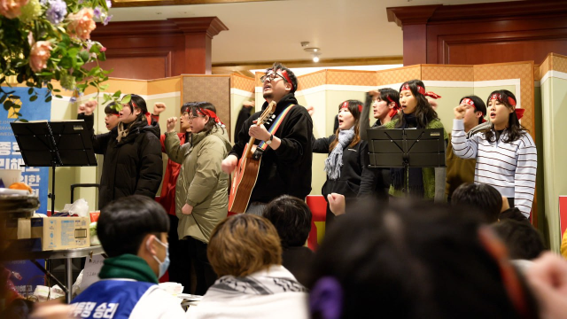 그 말에 용기를 얻었어요. 교섭이 끝나자마자 로비에서 구호를 외치며 앉았어요.