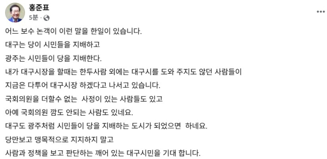 홍 전 시장은 25일 자신의 페이스북에 어느 보수 논객이 한 말이라면서 "대구는 당이 시민들을 지배하고, 광주는 시민들이 당을 지배한다"는 말을 올렸다.