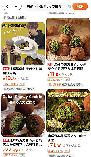 마지막으로 최근 한국에서 유행하고 있는 '두바이 쫀득 쿠키(일명: 두쫀쿠)' 도 거의 동시에 베이징, 상하이 등 여러 대도시에서 인기몰이 중이다. 한국에서는 이미 품귀현상으로 비싸게 팔리고 있으나, 중국에서는 상대적으로 아직 저렴한 가격으로 판매되고 있어 중국으로 여행 간 한국 사람들의 발길을 이끌고 있다. 두바이 쫀득 쿠키의 경우, 원래 두바이가 있는 중동 지역에서 즐겨 먹는 디저트인데 대륙을 횡단하여 한국과 중국 등지에서 인기가 있다.